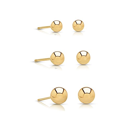 Charming and chic, these beautiful 14k Yellow Gold stud earrings have been finely crafted. The timeless design features a polished round ball stud that shines with an elegant finish. A simple yet sophisticated way to add an element of classic style to your look, these lovely studs can be dressed up or down and are perfect for any occasion. The set includes three small sized ball stud earrings (3mm, 4mm, and 5mm) complete with friction back closures. You can wear each exquisite pair individually, all three together, or even mix and match with other studs. Their petite size makes them an ideal fit for a second hole or cartilage piercing, and this simply gorgeous item is sure to become a go-to favorite pair!Feature