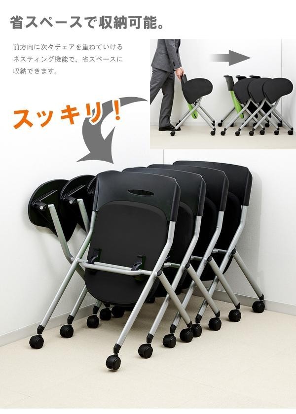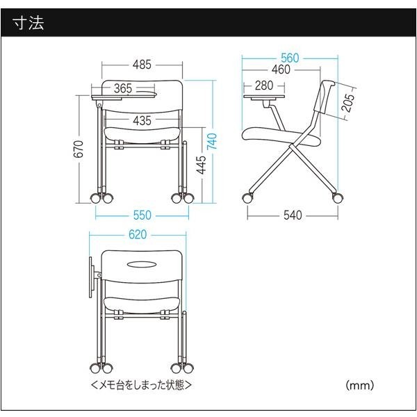 | 研修などに便利なメモ台付きミーティングチェアです。キャスター付きで移動がスムーズ、前方向に次々チェアを重ねていけるネスティング機能で、省スペースに収納できます。メモを取るのに便利なメモ台付きです。メモ台は折り畳んで収納することもできます。 |