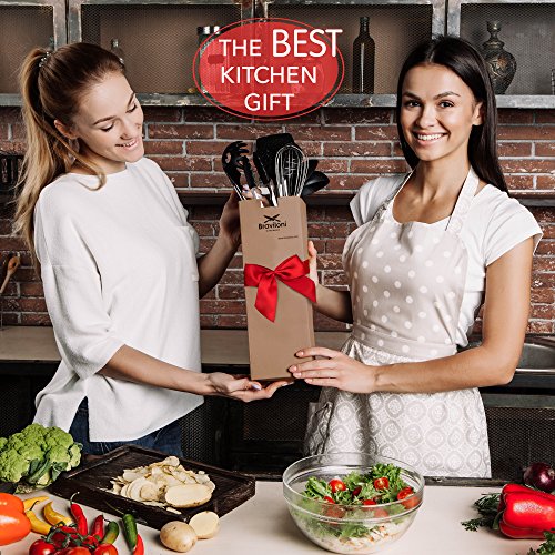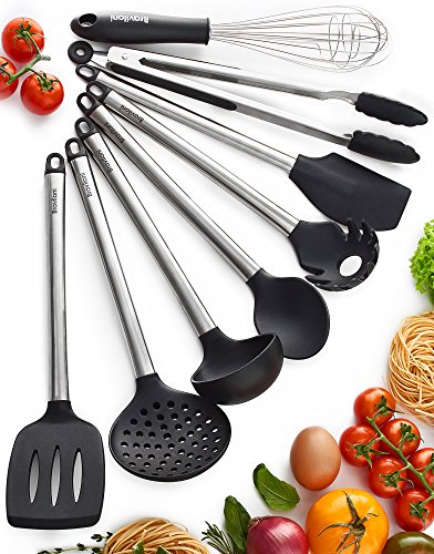 Kitchen Utensils - 8 Piece Cooking Utensils - Nonstick Utensil Set - Silicone and Stainless Steel Kit - For Pots and Pans - Serving Tongs, Spoon, Spatula Tools, Pasta Server, Ladle, Strainer, Whisk