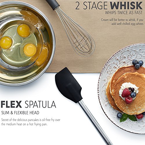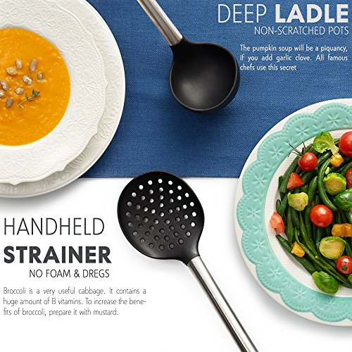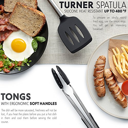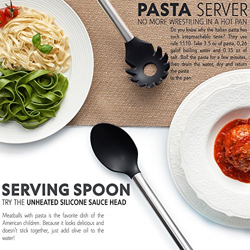 ✅ COMPLETE SET OF 8: Professional or home cook, this set of 8 kitchen utensils gives you all the tools to complement your dishes and make cooking much easier. The set includes tongs, turner spatula, flex spatula, pasta server, serving spoon, deep ladle, 2 stage whisk and a strainer.