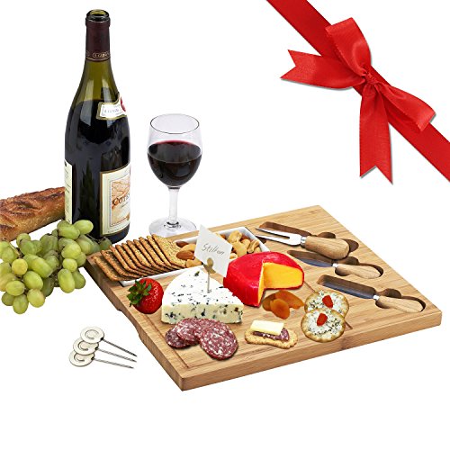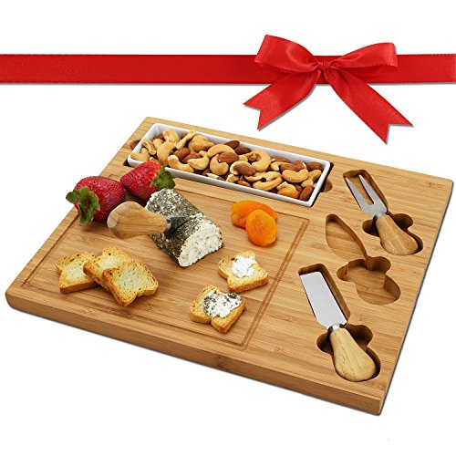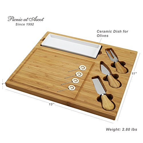 Picnic at Ascot Bamboo Cheese Board/Charcuterie Plate with 3 Stainless Steel Cheese Tools, Ceramic Dish, and Markers - A Great Holiday Gift for Gourmets