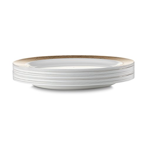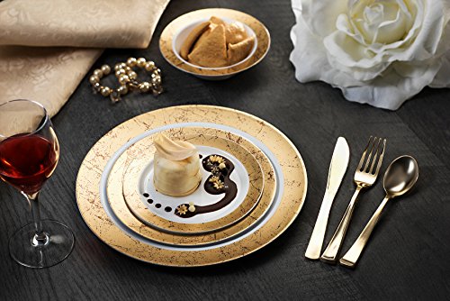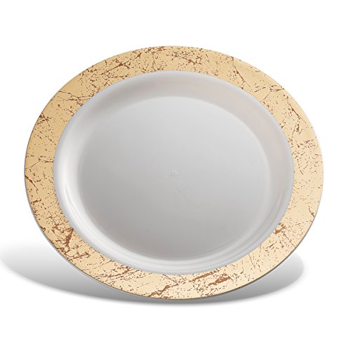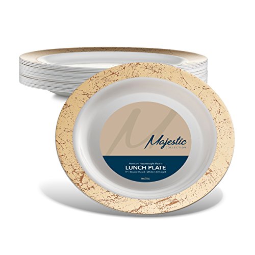 -MAJESTIC IS A MASTERPIECE!!! - High Gloss Shine...Stark Snow White ...Lustrous gold border....Rich Distinctive Look...all these characterize our MAJESTIC round plate collection created for sophistication and grace. Dress your table to perfection. Awe your guests with these gold speckled dinner plates, yet quit the hassle of washing dishes. Go green, go disposable so you're not left with a huge cleanup once your guests have left. Or, rewash and store for your next special occasion. --BENEFITS AND FEATURES-- ?Classical round shape design with gold speckled border to set your table to perfection ?Wow your guests and yourself alike ?Heavyweight premium quality plastic to ensure no sagging, tearing or breaking ?Perfect choice for weddings, receptions, banquets, reunions, holidays, or family get-togethers ?Great for outdoor entertaining too ?Just toss these disposable dishes and be on your way!!! ?Fun and Frugal?? Wash and reuse for your next event ?Pack of 20 Majestic heavyweight round white 9inch lunch plates with gold rim Isn't life better when we get together more often? Whether a backyard barbecue or an extended family reunion, we believe in the value of spending time with friends and family. Busy lives and long to-do lists often get in the way, but when we simplify events with beautiful disposables, we do get the time to get together. There's no better feeling. So what are you waiting for? Change The Look Of Your Table, WOW Your Guests With These White Gold Border Lunch Plates, And Set The Bar At An All-Time High. Type PRESTEE in the AMAZON SEARCH BOX to view our complete line of china-like dishes, plates, cutlery, party tumblers, and mini plates for your upscale celebration.TRUST US, You'll be GLAD you did!! #1Unique Round Place Setting CLICK ADD TO CART NOW!!! 0