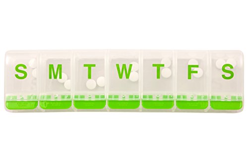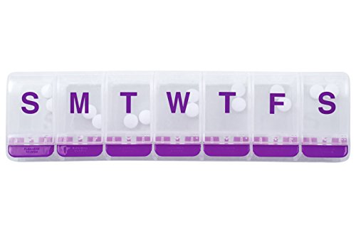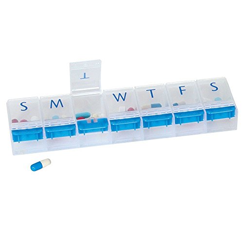 Studio : Ezy Dose Publisher : Ezy Dose Product Description You'll never forget another dose with this 7-day Classic Pill Reminder. The extra large compartments easily hold a daily dosage of medication or vitamins. Each compartment is large enough to hold 60 aspirin tablets. Made of translucent, durable plastic so you can tell if you took your medication without opening the lid. Each compartment lid indicates the day of the week by letter and braile markings. A great way to get organized without the hassle of opening several different bottles everytime your need to take your vitamins and medication. Simply full once a week and all of your medication and vitamins will be in one handy location. Also works great organizing fishing lurs, hooks, washers, beads and other small items. 0