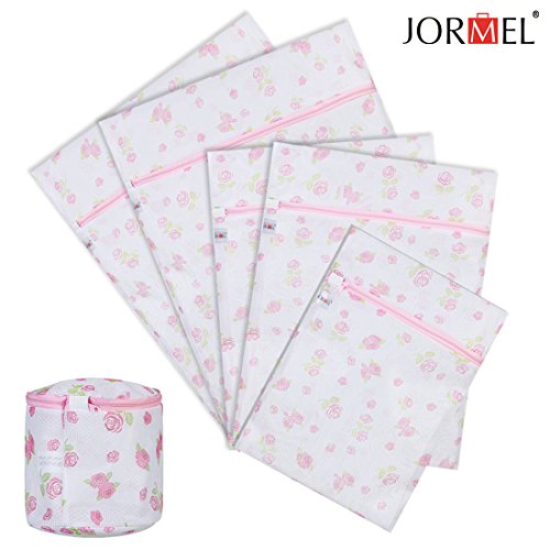 JORMEL Set of 6 Printed Mesh Laundry Bags 5 Washing Bags (1 M 2 L 2XL) and 1 Bra Bag for Laundry,Blouse, Hosiery, Stocking, Underwear, Bra and Lingerie, Travel Laundry Bag (Rose Printed)