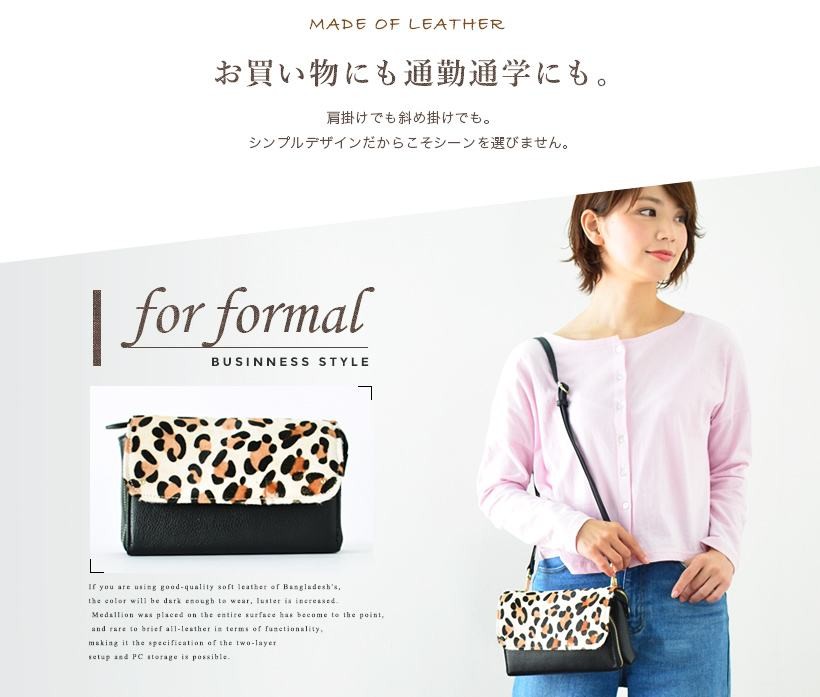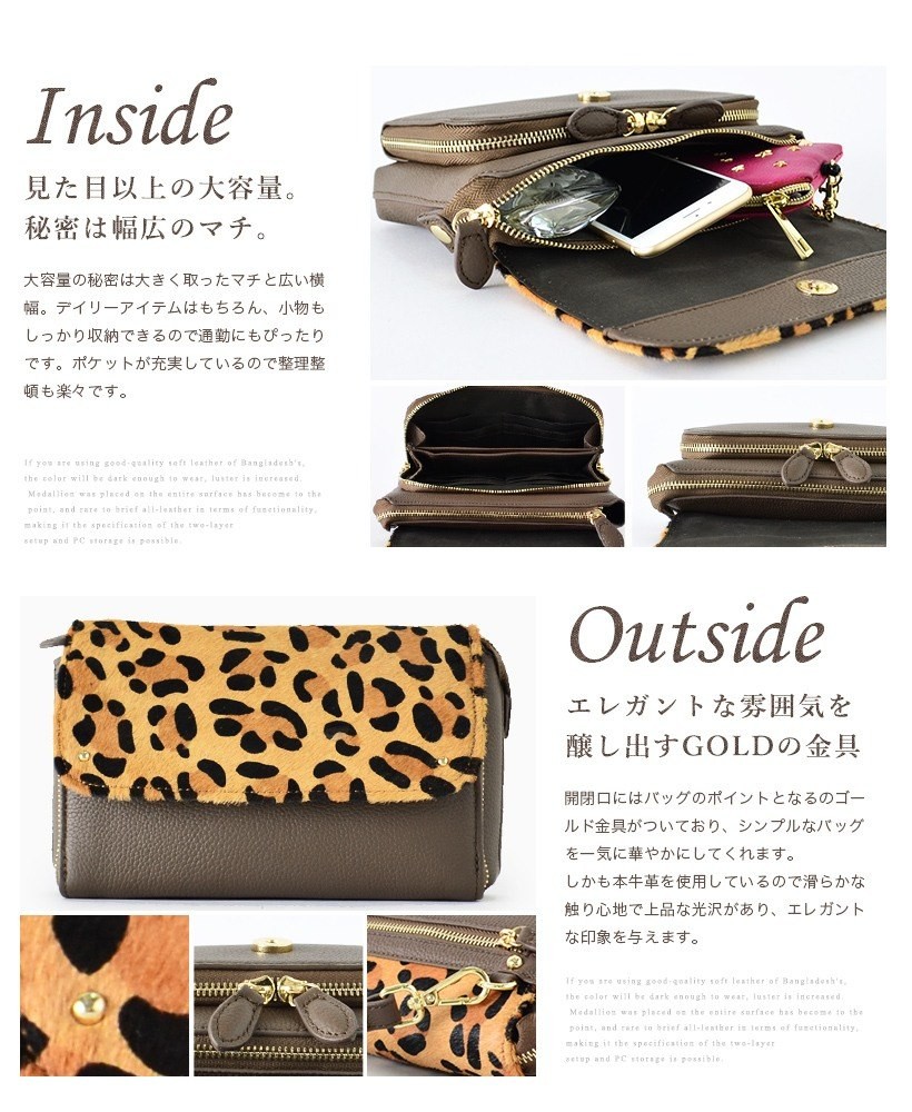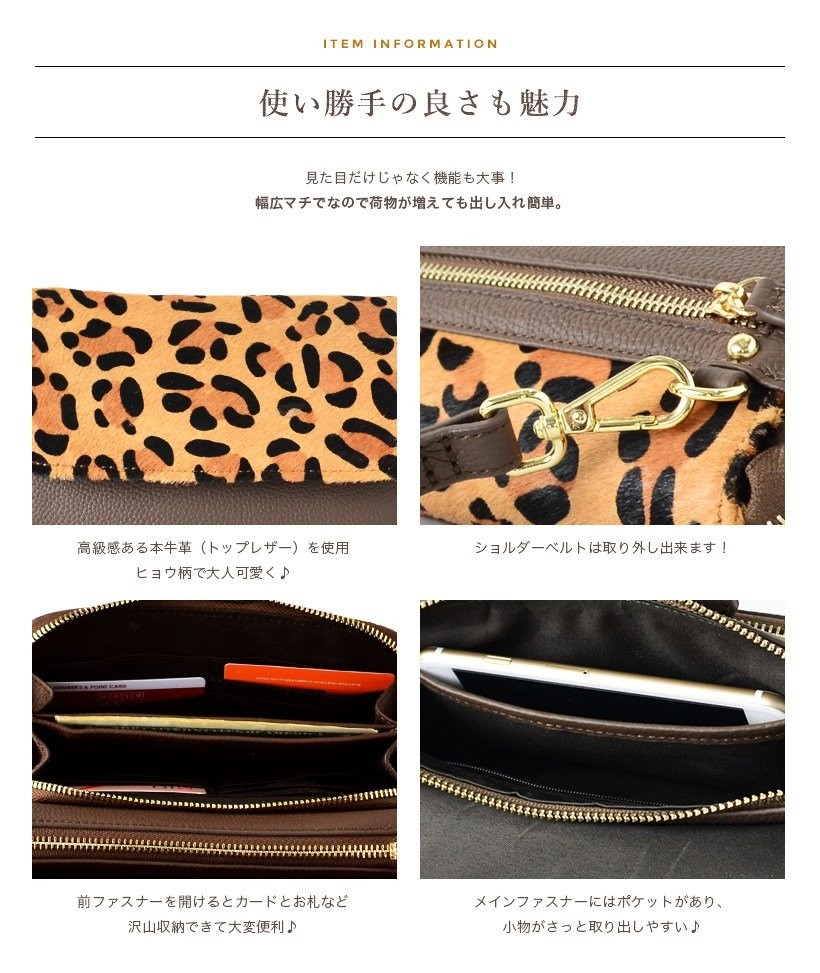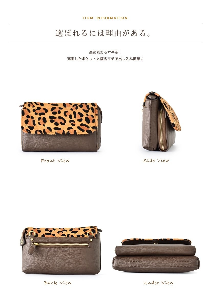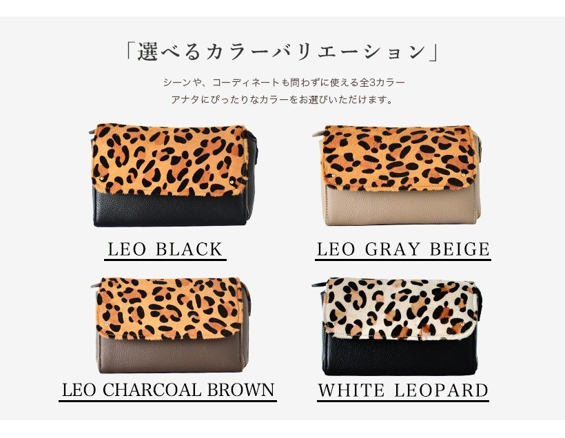 ●SIZE:高さ:約14cm / 幅:約23cm / マチ:約5.5cm●ショルダーベルト長さ:約67~123cm×幅:約1.5cm(取り外し可能/調節可)●外ポケット:前面ファスナー付きポケット1(カード入れ12箇所、マチありオープンポケット2、マチなしオープンポケット1)、背面ファスナー付きポケット1●内ポケット:オープンポケット1、ファスナー付きポケット1●重さ:約450g●素材:本牛革(トップレザー)、ハラコ●仕様:2way●バッグのメイン開閉口はマグネット&ファスナーになっております。[カラー]レオブラック・レオグレーベージュ・レオチャコールブラウン・ホワイトレオパードメーカーより取り寄せ商品のため、在庫状況によっては欠品・廃盤の可能性があります。あらかじめご了承ください。