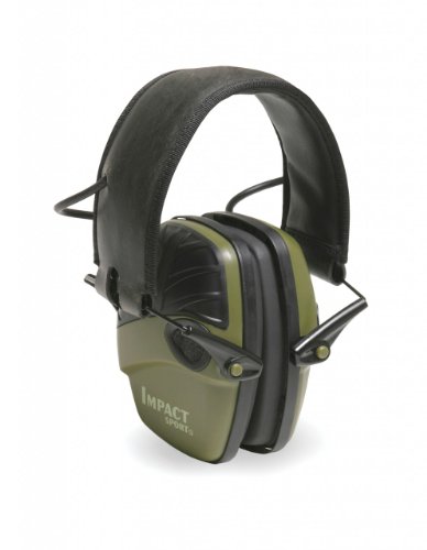 -. Feature : Built-in directional microphones amplify range commands and other ambient sounds to a safe 82dB, providing more natural listening and enhanced communication / Actively listens and automatically shuts off amplification when ambient sound reaches 82 dB; Noise Reduction Rating (NRR): 22 / Features low profile earcups for firearm stock clearance; adjustable headband for secure fit; compact folding design for convenient storage; classic green color / Each includes AUX input and 3.5mm connection cord for MP3 players and scanners / Each includes 2 AAA batteries; automatic shut-off feature after 4 hours increases battery life