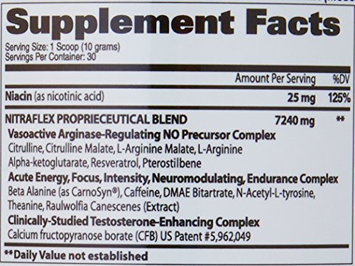 The Nitra flex pre-training formula contains ingredients that in vitro, animal and clinical studies suggest possess properties that may help advanced athletes maximize energy, intensity, vascularity and reactive hyperemia (pumps) during their workouts, and provide long-term support of testosterone and nitric oxide levels in the healthy range when used as directed. Unique properties of some of the key compounds in Nitra flex: 1-scoop potency: Nitra flex is so potent, only 1 scoop (1 serving) is necessary. High citrulline: arginine ratio: arginine is a proven precursor in nitric oxide (no), a vasodilator. What most people don't know is that arginine supplementation stimulates the activity of anginas, an enzyme that breaks down arginine. Over time, this may actually result in reduced arginine and no levels in turn causing your pre-workout formula to stop working. Research suggests that supplementing with a high ration of citrulline to arginine may reduce this risk by avoiding overstimulation of anginas. 6 weeks of testosterone: calcium fructopyranose borate (CFB) has been shown to increase testosterone in health subjects. The average increase in total and free testosterone in a 6-week study was 56% and 29.5% respectively. In a second study, total and free testosterone increased on 3 hours after a single dose of CFB. Effective doses of beta-alanine: the clinically-proven performance enhancer beta-alanine was not "fairy dusted" in this formula. Rather, we added an exceptionally powerful does that you will feel working following your very first serving. Creatine-free: creatine causes water retention, which can make achieving a dry, hard muscular look even more difficult. Sometimes creatine is added to products precisely for this reason.Feature
