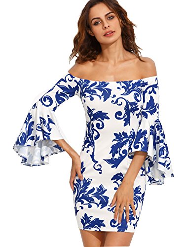 Title : Floerns Women's Off Shoulder Bell Sleeve Bodycon Cocktail Party Dress Blue White L