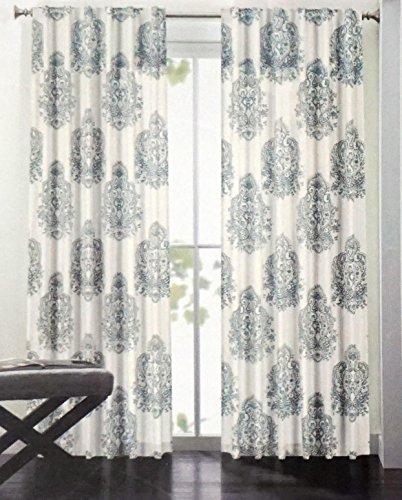 Nicole Miller Set of 2 Long Window Panels Curtains Drapery Hidden Tabs 52 Inches by 96 Inches Blue / Gray Scroll Medallions on White