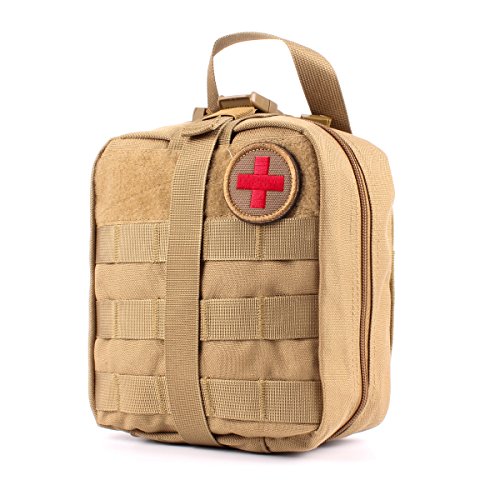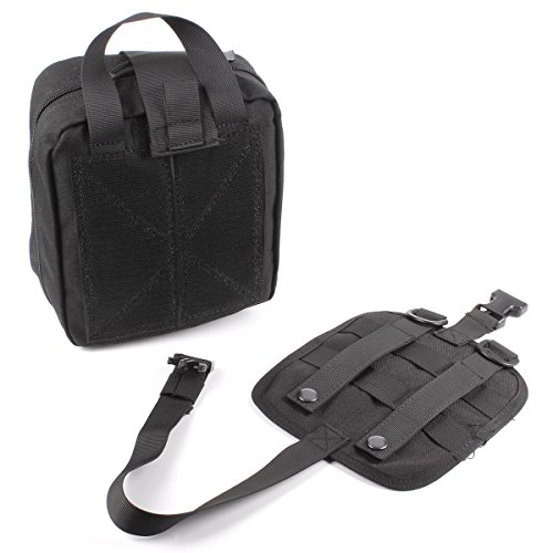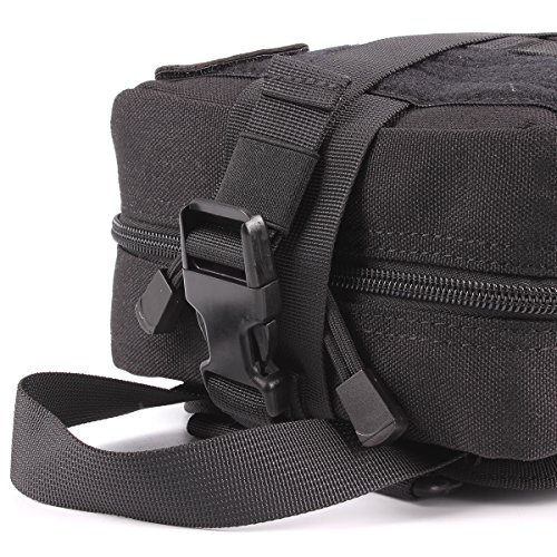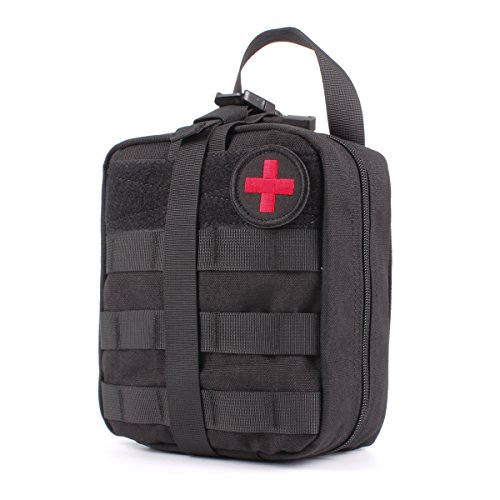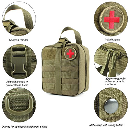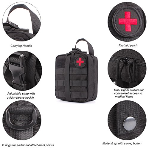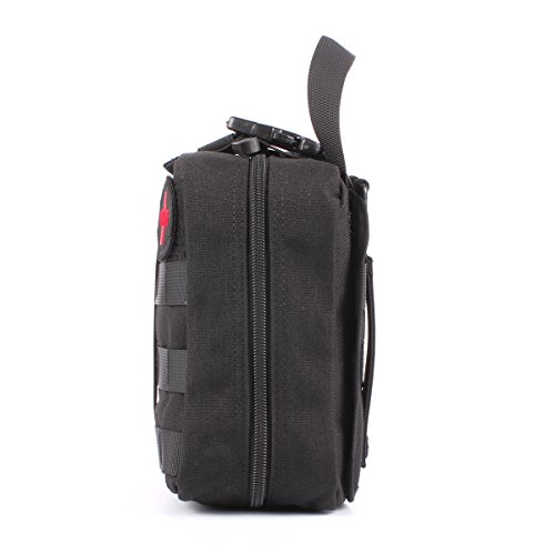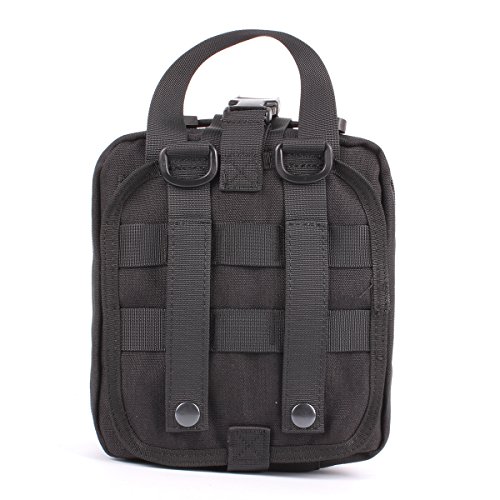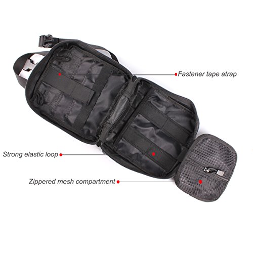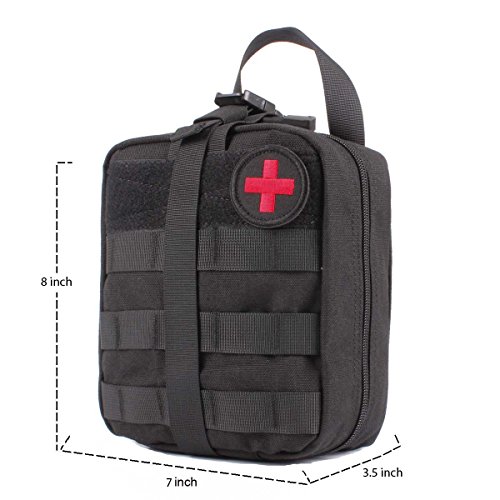-. Feature : Size: Approx.8 X 6 X 3.5 inches (H x W x D) 900D anti-abrasion nylon MOLLE compatible EMT first aid pouch for emergency or tactical situations. / Tri-fold design that provides fast access to first aid supplies,rip away Velcro panel and wide handle for removal or carrying quick access to first aid supplies. / Double zipper closer, multiple pockets, elastic loops, instrument holders and zippered mesh compartment for small supplies. / Safety strap, and zippered mesh compartment for small first aid supplies. / Includes: First Aid Patch, a mesh drawstring bag for extra small supplies, 2 inches Velcro panel across front of pouch and D-rings for additional attachment points.