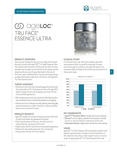 Now you can enhance the way your skin ages and embrace the look of youth with ageLOC® Tru Face® Essence Ultra. Formulated with the power of Ethocyn®, Nu Skin's firming specialist also employs our revolutionary anti-aging science, targeting the sources of aging that lead to the loss of firmness. Leave undefined skin in the past and enjoy firmer, younger looking skin today and in the future, with ageLOC Tru Face Essence Ultra.