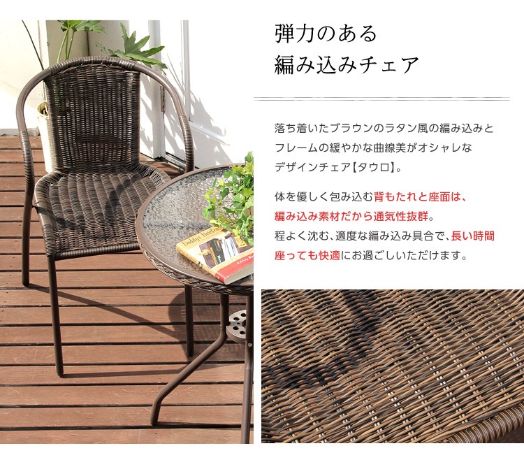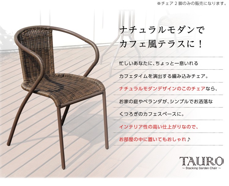 【商品について】スタッキングチェア【TAURO-タウロ-】(スタッキングチェア ガーデニング)■サイズ:外寸:(約)幅49x奥行き55x高さ75cm※商品重量:(約)4kg ※1脚あたり■カラー:ブラウン■素材:PVC、スチール(紛体塗装)■その他:・完成品でのお届けです。・梱包サイズ:(約)62x52.5x83cm(10.0才)・梱包重量:(約)11kg ※2脚同梱 ※メーカー直送品、商品代引き不可【商品について】