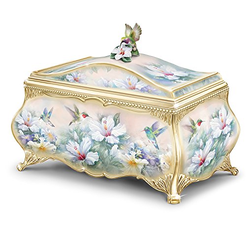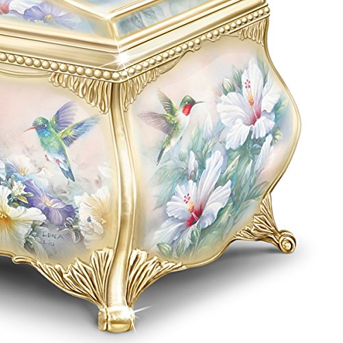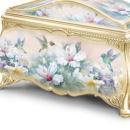Feature : Delight in the garden masterpieces of watercolor-on-silk artist Lena Liu as they take center stage on the Lena Liu's Jewels of the Garden Music Box, a limited-edition fine porcelain bird music box only from The Bradford Exchange / Exquisitely handcrafted of triple-fired Heirloom Porcelain® and lavished with rich 22K-gold accents, this vintage-style music box is reminiscent of costly ones found in antique stores / Ornate scrolled edges, elegant curves, raised, decorative embellishments and delicate feet give it the look of treasured music boxes of old / Atop the removable lid is a radiant ruby-throated hummingbird and hibiscus blossom, expertly sculpted and hand-painted with remarkable detail / Lena Liu's romantic hummingbird art graces all four sides and the lid of the music box