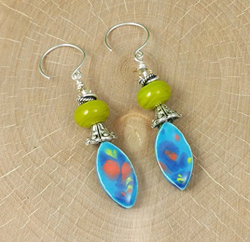 -. Brand : Fire and Fibers -. Color : dark blue lime green orange yellow bold -. Department : Women -. ProductGroup : Guild Product -. ProductTypeName : GUILD_JEWELRY -. Title : 1 Pair of Dew Drops Earrings in Blooming Blue Lime Green and Sterling Silver Lampwork Glass