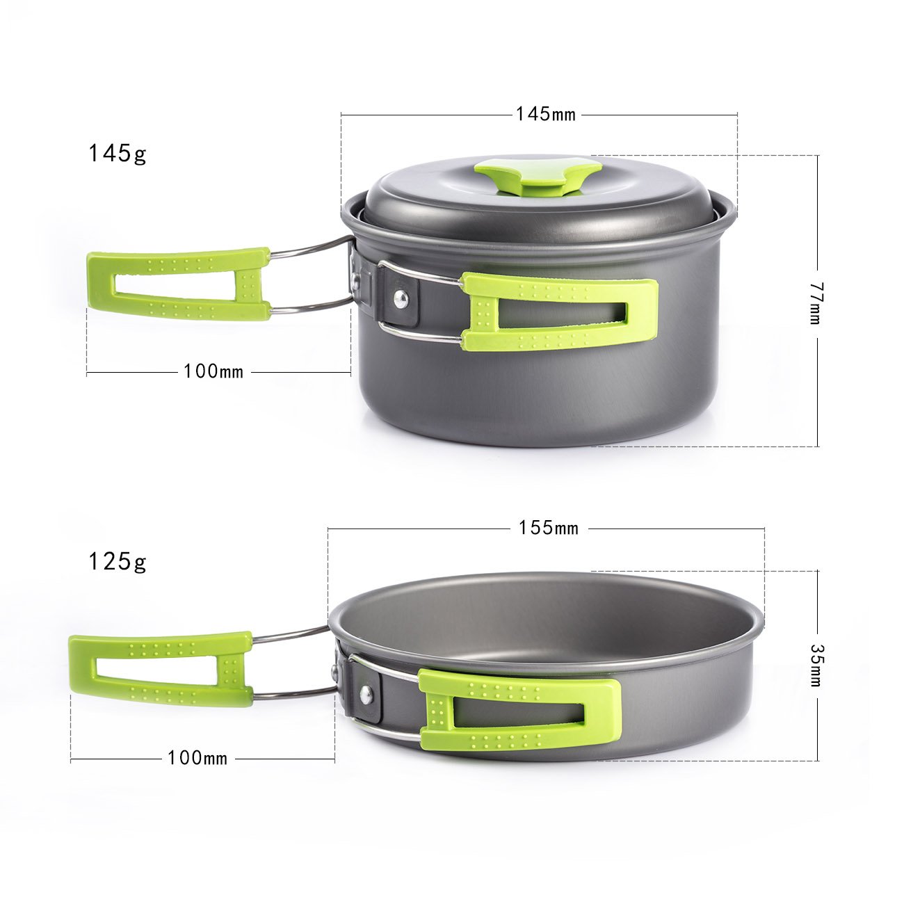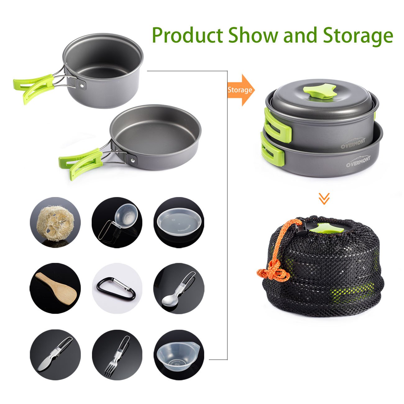 Set contents (14 pieces set): Pot and lid × 1 frying pan × 1 bowl × 2 rice paddle × 1 ladle × 1 dish × 1 clean sponge × 1 storage bag × 1 climbing button × 1 3 pieces of knife and fork and spoon