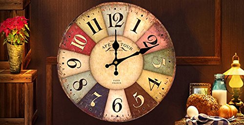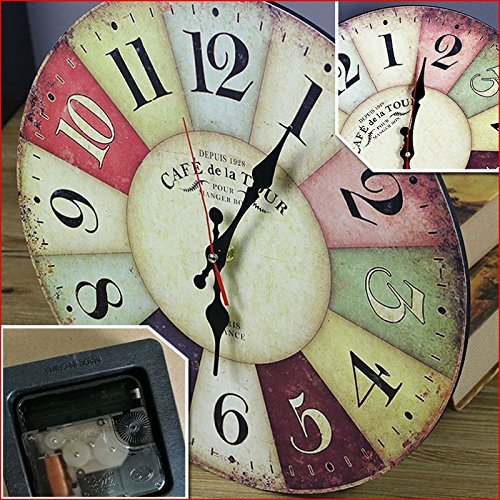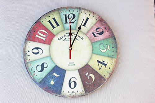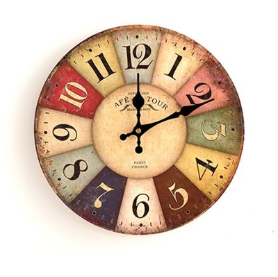 -. Feature : 新品です。エイジング加工を施しておりヴィンテージやアンティーク風に仕上げおります。 / カラフルなデザインなのでお部屋のアクセントカラーに合わせやすいです。 / 流行の西海岸テイストの時計。ナチュラルやヴィンテージのインテリアにもしっくりきます。 / 文字盤本体は厚さ0.5mmと薄い板になっております。 / 電池、保証書はついておりません。  【サイズ】直径30cm×厚さ0.5cm 【重量】240g 【素材】木製   中国製
