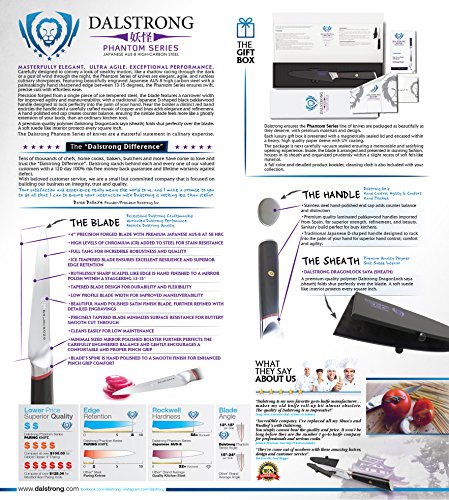 완전한 당과 정밀도에 dalstrong터치:단일의 피스의 ICE강화,고탄소,일본어aus-8강철로부터 단조58?+록 웰 경도로는,Phantom시리즈는 탁월한 샤프하고 엣지의 보존,강도와 내구성을 준비 있습니다. 아름답고,각인,블레이드 형상이 자연스러운을 강화 척추와 인간공학을 수작업으로 연마 한층 더 기능과 매끄럽 핀치 그립」를 참조해 하십시오.
