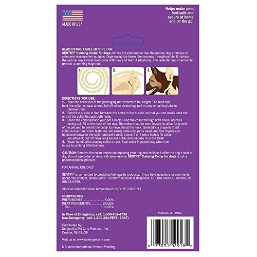 Studio : Sentry Publisher : Sentry Binding : Misc. Product Description Sentry Good Behavior Pheromone Collars are activated by the dogs body heat. The collar releases pheromones over 4 weeks, making it an ideal way for owners to help control stress related behavior as well as to help socialize the animal with other dogs. The Sentry HC Collar has the same technology available as a diffuser or spray, and goes wherever your dog goes, making the treatment more consistent. Soothing lavender and chamomile fragrance. Directions: Place collar around pet's neck, adjust to fit dog's neck comfortably. The collar must be worn loosely to allow for growth of the pet and to permit the collar to move about the neck. Generally, a properly fitted collar is one that when fastened, will snugly slide over pet's head. Leave 2 or 3 inches for extra adjustment. Cut off the excess portion of the collar. The collar is designed to release powder when applied, which will activate the pheromones. When fresh collars are stretched out they show an excess of powder. This powder is primarily a carrier for the pheromones and not the pheromones themselves. This powder is not harmful to animals. Wash hands after placing collar on pet. The effects of one collar last up to 30 days. Seal collar in plastic bag when not in use to prolong the effect. 0