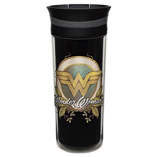 - 16 oz. Insultated Travel Tumbler with Liquid Lock Slide lid keeps contents warm and inside the cup while on the go; featuring Retro Wonder Woman graphics from DC Comics