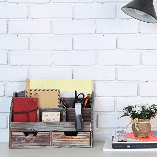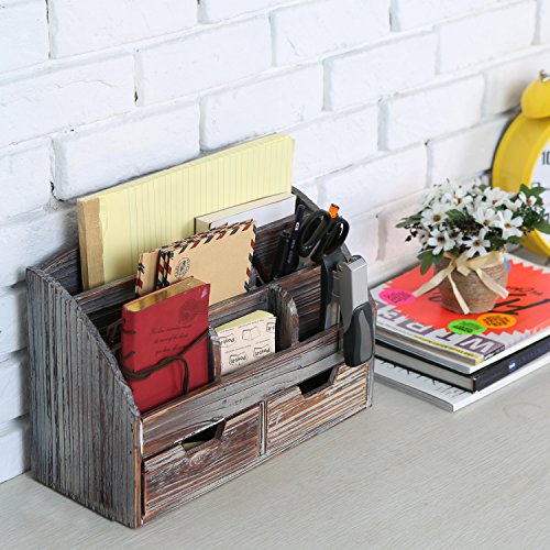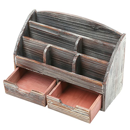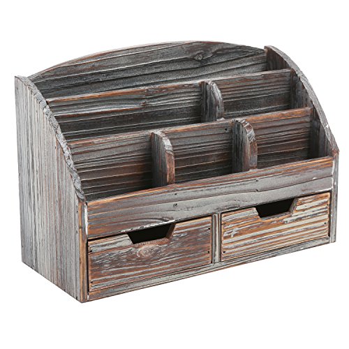 A desktop organizer made of wood with a rustic-style distressed finish.