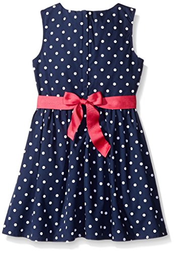 Sleeveless dress in allover polka dots featuring round neckline with pleated bodice and contrast removable grosgrain belt