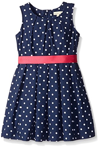 Sleeveless polka dot dress featuring pleated bodice with contrast removable grosgrain belt