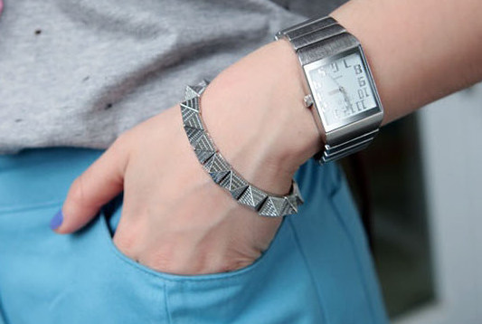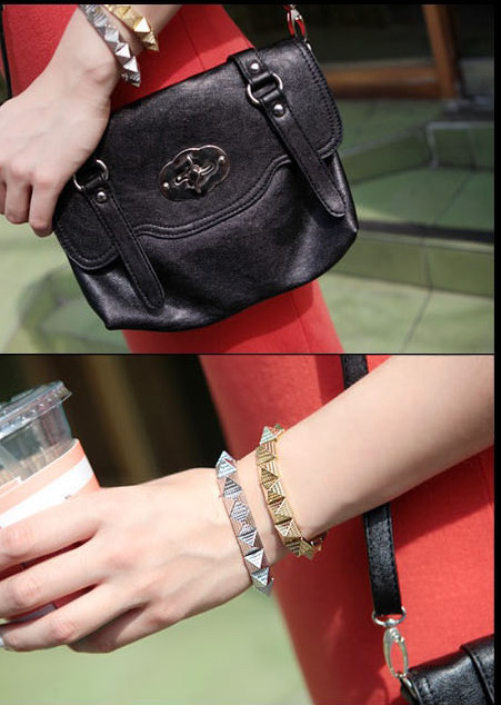 ・三角ピラミッド形の金属ブレスレットです。ビンテージ・パンク ファッション さりげないコーデアイテムに。