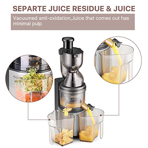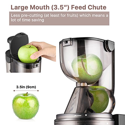 Extra wide feeding chute / feeder mouth tube to accommodate most produce whole; juice without cutting into small pieces. Multi-purpose juicer works with both fruits and vegetables; Support continuous juicing with automatic pulp ejection with separate juice outlet and pulp outlet