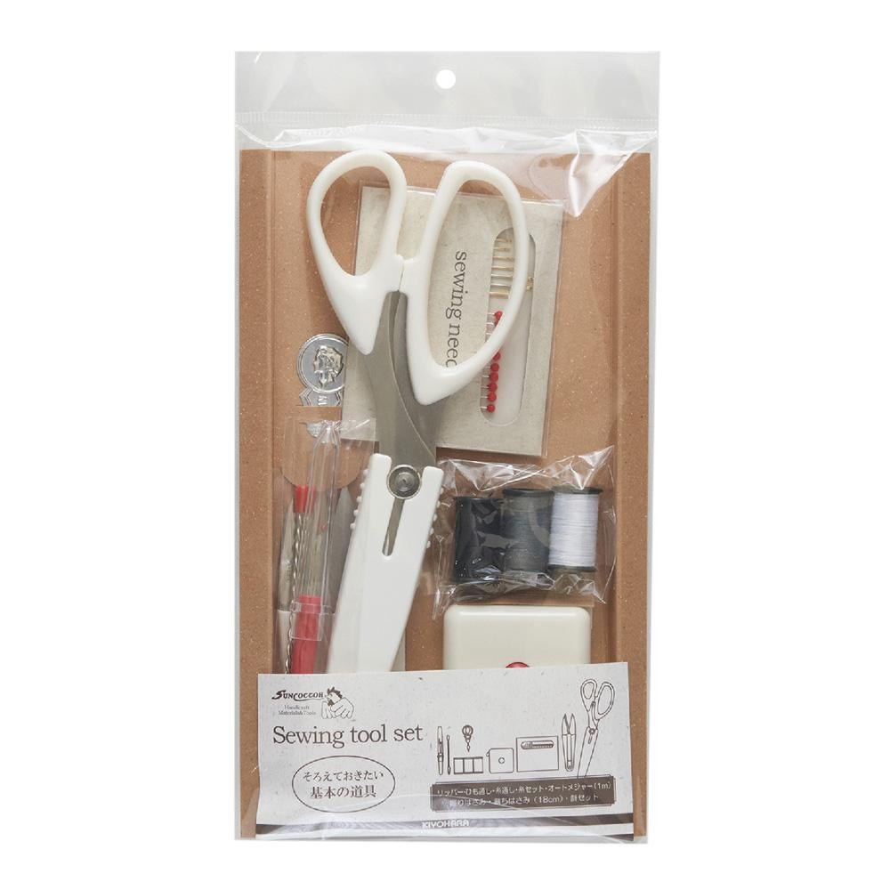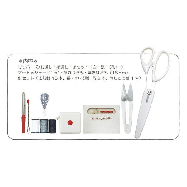 fk094igrjs基本の道具8点がセットになったソーイングセット サイズ 個装サイズ:22×12×2cm 重量 個装重量:132g 製造地 中国、日本、台湾 裁縫に必要な基本の道具セット 基本の道具8点がセットになったソーイングセット