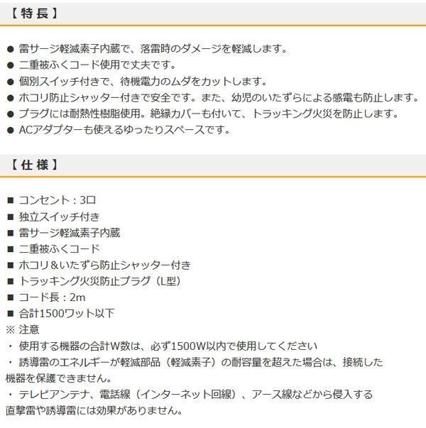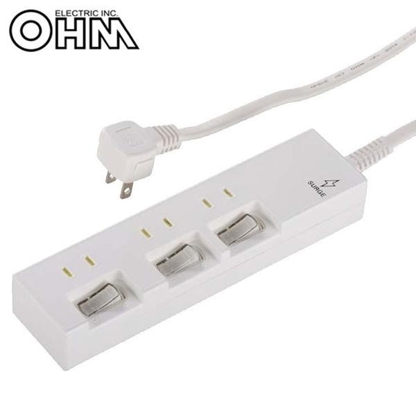 ホコリ&いたずら防止シャッター付きコンセント。丈夫な二重被ふくコードです。 生産国:中国 ※サプライヤー直送品 ご注文後3~4営業日後の出荷となります【商品名】OHM 雷ガード/個別スイッチ付き 節電タップ 3個口 2m HS-T1398W