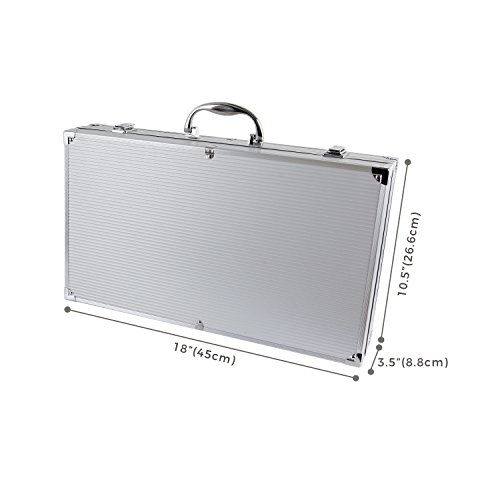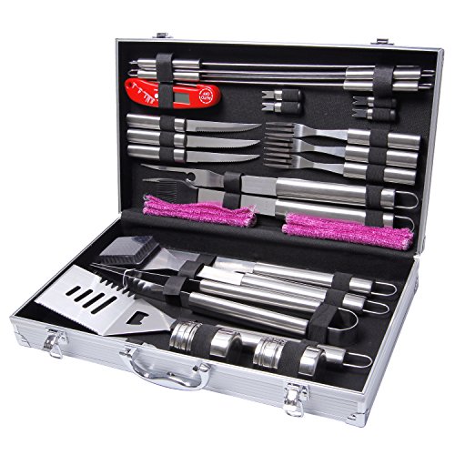 - PREMIUM MATERIALS: Features 26-piece barbecue and grilling tool set that is constructed of high quality stainless steel for maximum reliability and long lasting durability. The tool set comes with a dual latch aluminium storage case for easy transportation and storage.