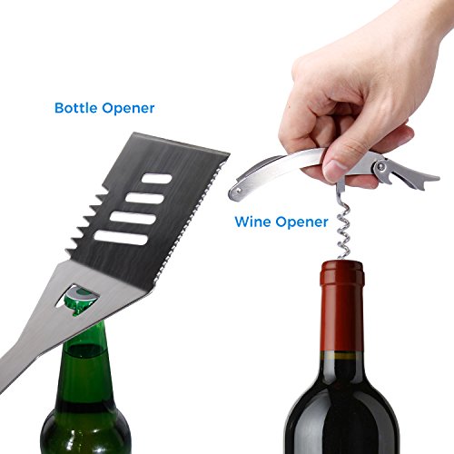 - 26-PIECE BARBEQUE SET: The barbecue & grilling tool set includes 1 tong, 1 slotted spatula & bottle opener, 1 wine opener, 1 all-purpose 8" knife, 3 small forks, 1 meat fork, 1 grill brush, 1 silicone basting brush, 3 steak knives, 4 corn holders, 4 skewers, 2 cleaning cloth (random color), 2 spices bottles, 1 digital thermometer, and 1 aluminium storage case.