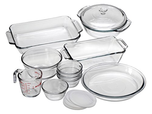 Anchor Hocking Oven Basics 15-Piece Glass Bakeware Set with Casserole Dish, Pie Plate, Measuring Cup, Mixing Bowl, and Custard Cups with Lids