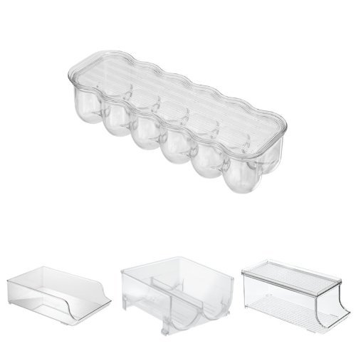 InterDesign 4-Piece Kitchen Stackable Organizer Set: Fridge Binz Egg Holder, Water Bottle Storage, Stackable Wine Holder, Soda Can Plus Holder - Clear