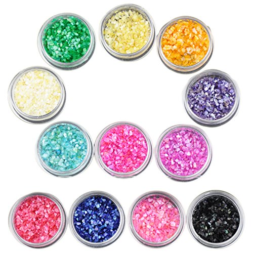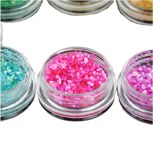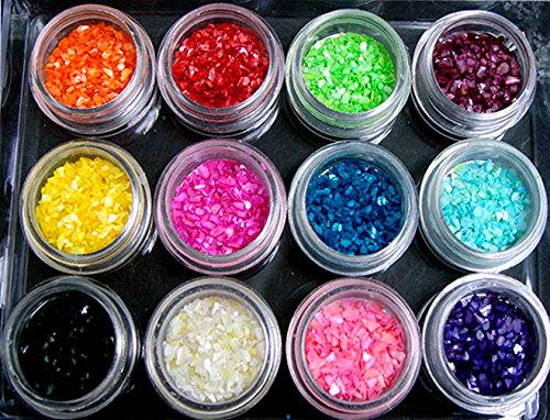 -. Feature : Crushed shell chips / glitter in 12 different colors / Suitable for nail art decoration with nail polish, UV builder gel, etc. / Can be worn on face and body! / Diameter of each jar : 3cm