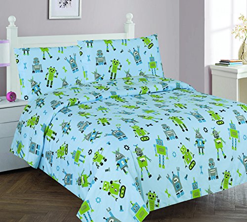 Elegant Home Multicolor Blue Green Robots Design 4 Piece Printed Full Size Sheet Set with Pillowcases Flat Fitted Sheet for Boys / Kids/ Teens # Robot (Full)