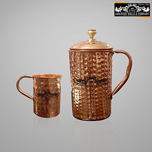 Perfect fit drink ware set for kitchen: This set of Single Copper Hammered Jug with Brass Knob and 1 Copper Pipe Hammered Mug, this set can be used for various purposes and this solid metal ware kitchen set will last for a lifetime and needs no replacement. You can serve your guests in these glasses and grab compliments from them. NOTE: Do not store consumables that tend to react with copper metal such as dairy products, citrus liquids, etc.