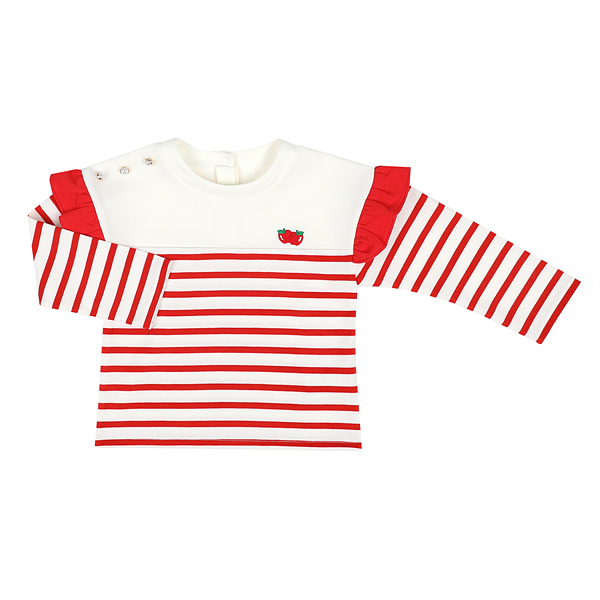 상품설명 레드 스트라이프 배색 티셔츠 입니다. 상판에 아이보리 배색으로 캐쥬얼하면서도 소매에 프릴이 러블리한 느낌을 줍니다. 드롭숄더로 편안한 실루엣으로 어떠한 하의와도 코디가 용이합니다