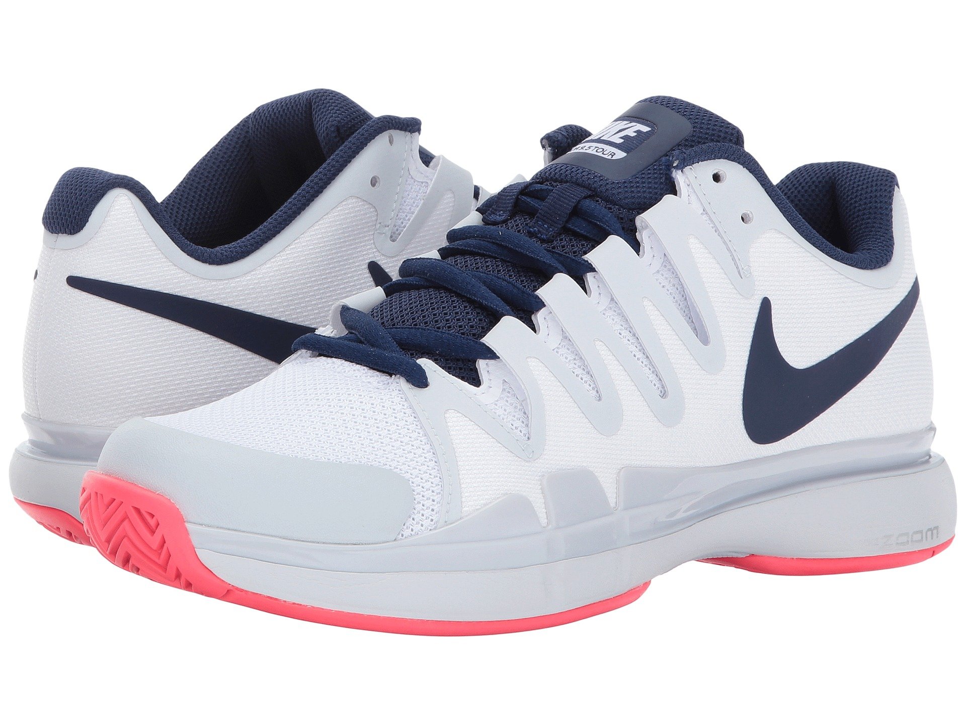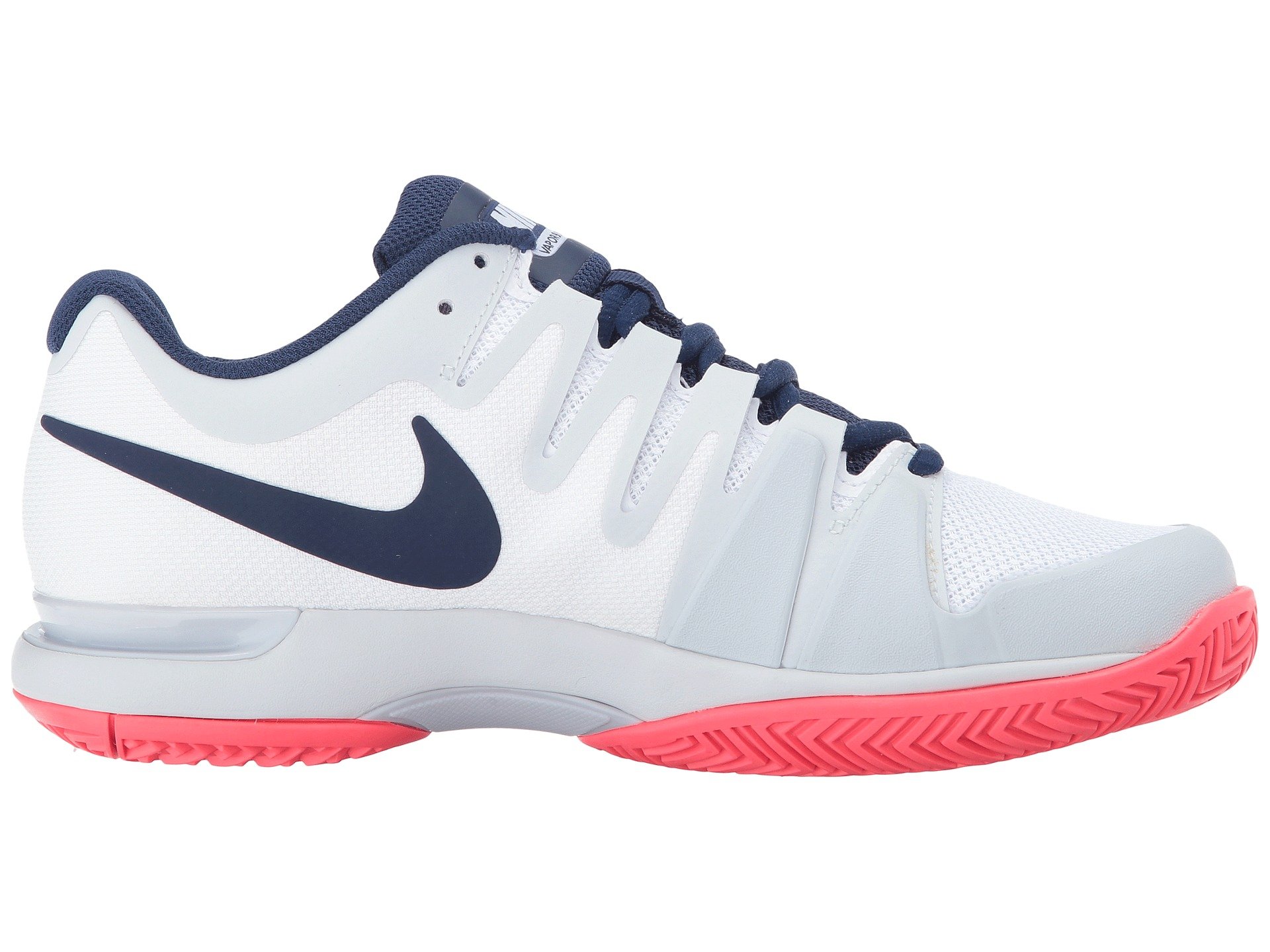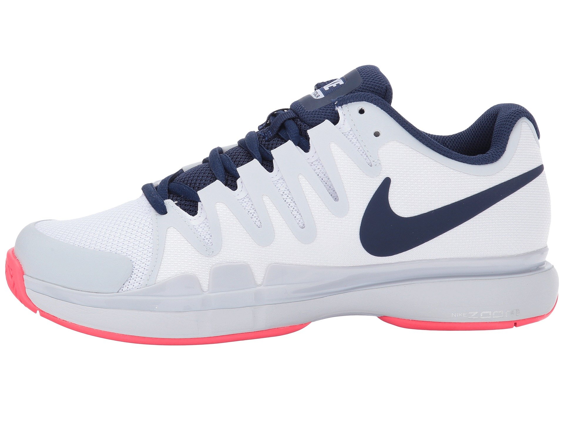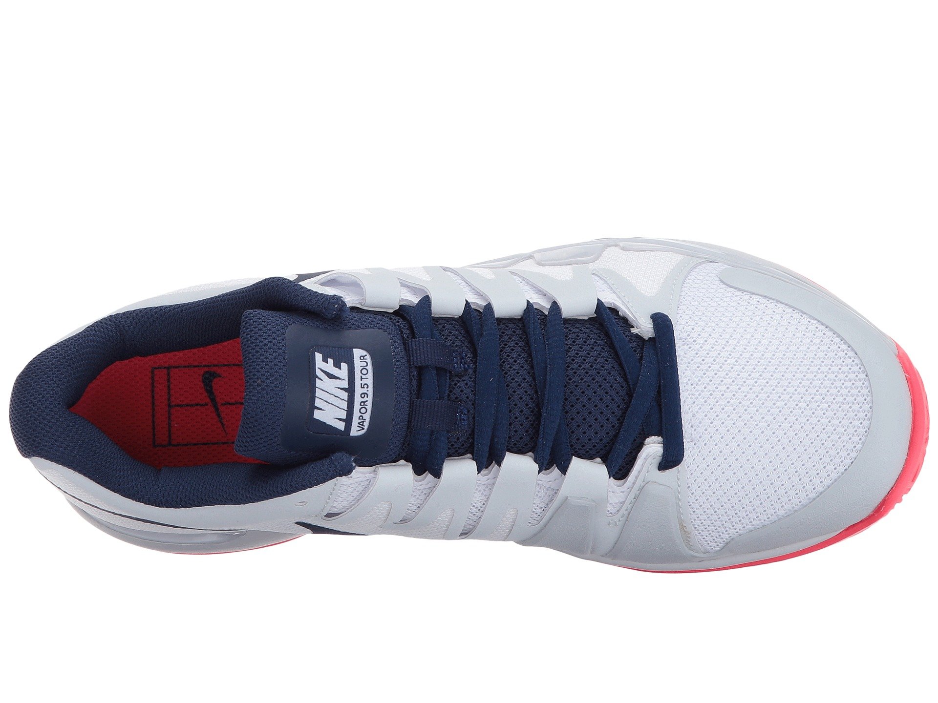| Product Information SKU: #8255538The Nike? Zoom Vapor 9.5 Tour tennis shoe features an adaptive fit system and Nike Zoom units for low-profile, super responsive cushioning.Mesh upper with textile graphic overlays for breathability and style. A padded tongue and collar provides comfort and support. Lace closure for a snug fit. Breathable textile lining. Adaptive Fit technology combines with lightweight textiles to create a zero distraction upper. Enhanced durability in the tip and medial side.Nike Zoom unit in the heel with a Phylon midsole for lightweight responsive cushioning.XDR rubber outsole with herringbone pattern for excellent hard court traction, and a visible midfoot shank for great transition. Deep flex grooves for enhanced articulation and natural movement.Imported.Product measurements were taken using size 8, width B - Medium. Please note that measurements may vary by size.Weight of footwear is based on a single item, not a pair.Measurements: Weight: 11 oz |