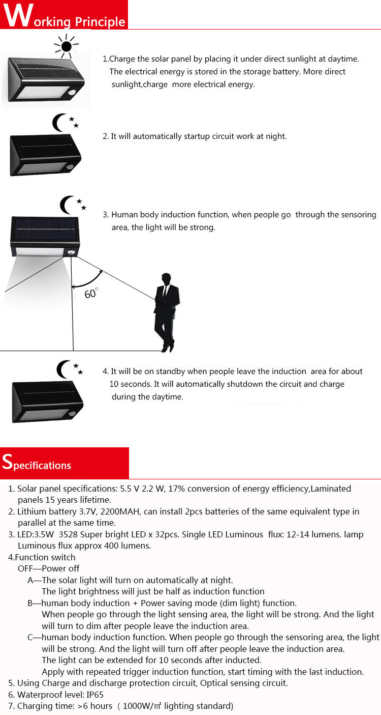 To meet more needs, the solar light has 4 modes:OFF/ Auto-bright in the dark / Bright when people come,dim when people left/ Bright when people come, off when people left.