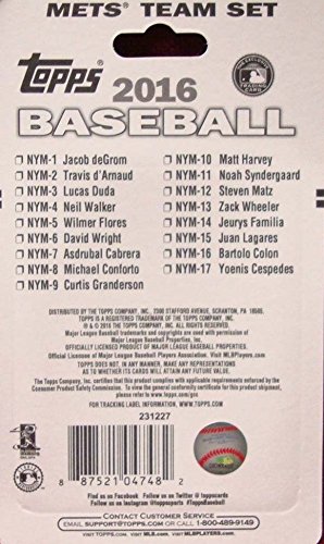 This is a 2016 Topps New York Mets Factory sealed special edition 17 card team set; cards are numbered NYM-1 through NYM-17 and are not available in packs. Players included are Michael Conforto, Jacob DeGrom, Travis d'Arnaud, Lucas Duda, Neil Walker, Wilmer Flores, David Wright, Asdrubal Cabrera, Curtis Granderson, Matt Harvey, Noah Syndergaard, Steven Matz, Zack Wheeler, Jeurys Familia, Juan Lagares, Bartolo Colon and Yoenis Cespedes.