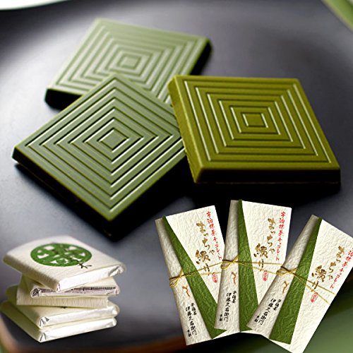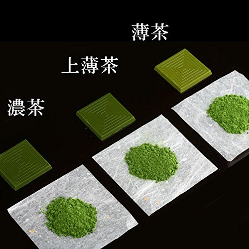 「薄茶」「上薄茶」「濃茶」3種の違い:抹茶6%以上配合。一口サイズの芸術品に込められた、おのおのの抹茶の香りや苦みの違いを、心行くまで食べ比べてください。他では味わえない、京都の老舗お茶屋の髄を尽くした抹茶のチョコレート。すっきりしたあと味の「薄茶」、香りと渋味のバランスが取れた「上薄茶」、高貴な香りとまろやかな旨味が魅力の「濃茶」、3種それぞれの味わいがあります。