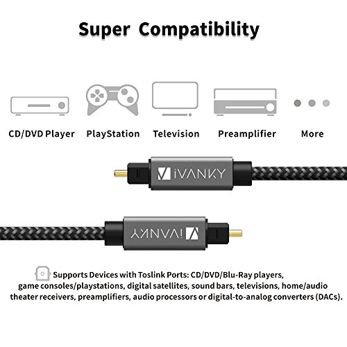 Compatibility: iVanky Digital Optical Cable works with devices with Toslink ports, like sound bars, televisions, game consoles/PlayStations, CD/DVD/Blu-Ray players, home/audio theater receivers, preamplifiers, digital satellites, audio processors or digital-to-analog converters (DACs).