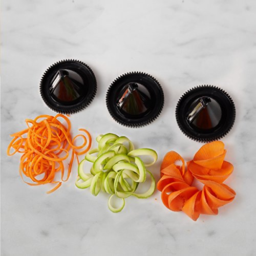★3 Interchangeable Blades-- With 3 interchangeable stainless steel cutting cones: spaghetti, pappardelle and circle blade allow you to turn a wide variety of fruits and vegetables into spirals, noodles and ribbons to create enticing side salads, healthy snacks and low-carb meals.