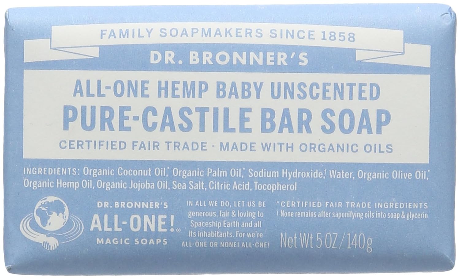 「マジックソープ バー ベビーマイルド140g (正規輸入品)」は、有機栽培されたオリーブ油、ヤシ油で作ったベースに、ヘンプ油とホホバ油を絶妙にブレンドしたDr.ブロナー社製の洗顔石鹸です。このソープだけで洗顔やボディ洗浄、クレンジングなど、全身にお使いいただけます。合成界面活性剤、合成防腐剤、合成着色料は使用していません。無香料タイプです。