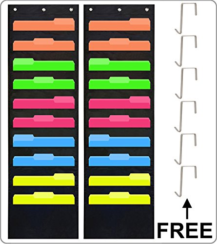 Pack of 2 - Wall Storage Pocket Charts Hanging Door File Folder Organizer with 10 Pockets, Including 3 Hooks,Black