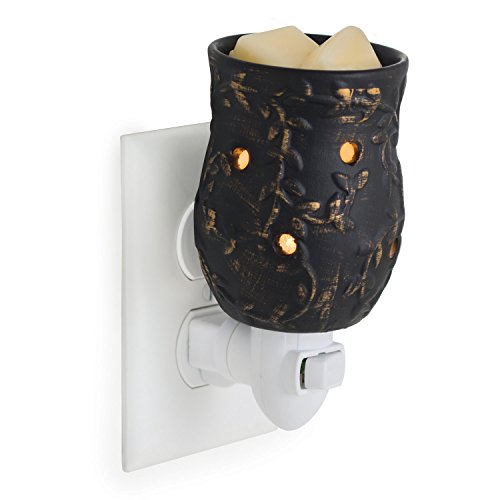 - This Pluggable Warmer, in an elegant all over black with rich, burnished gold vine accents, uses a soft halogen bulb to create a warm glow and release the scent of your favorite fragrance