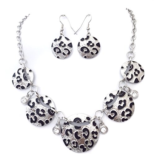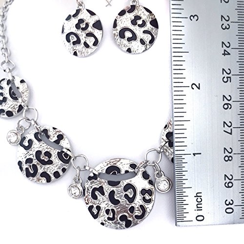 -. Title : Leopard Print Silver Tone Rhinestone Dangle Disk Necklace Earrings Set