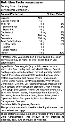 Ingredients: Soy nuggets (soy protein isolate, tapioca starch, rice flour, barley malt, salt), maltitol syrup, peanut coating (sugar, palm kernel and palm oil, partially defatted peanut flour, whey protein isolate, reduced mineral whey protein, soy lecithin, salt, natural flavor), polydextrose, peanut butter natural, soy protein isolate, whey protein concentrate, glycerin, dry roasted peanuts, peanut flour, inulin (chicory and/or jerusalem artichoke), high fructose corn syrup, soy lecithin, peanut oil, natural flavors, salt, skim milk powder, water, fractionated palm kernel oil, sucralose, peanut extract, cream, butter salted, monoglycerides, mixed tocopherols, disodium phosphate, carrageenan, dextrose. Contains: Milk, soybeans, peanuts. Caution:This product is manufactured in a facility that uses other nuts, egg, wheat and seeds.Feature