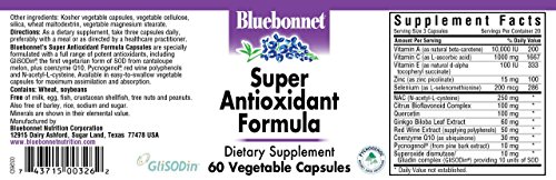 Bluebonnet's Super Antioxidant Formula Vcaps are specially formulated with a full range of potent antioxidants, including GliSODin, the first vegetarian form of SOD from cantaloupe melon, plus coenzyme Q10, Pycnogenol, red wine polyphenols and N-acetyl-cysteine in easy-to-swallow vegetable capsules for maximum assimilation and absorption.Feature